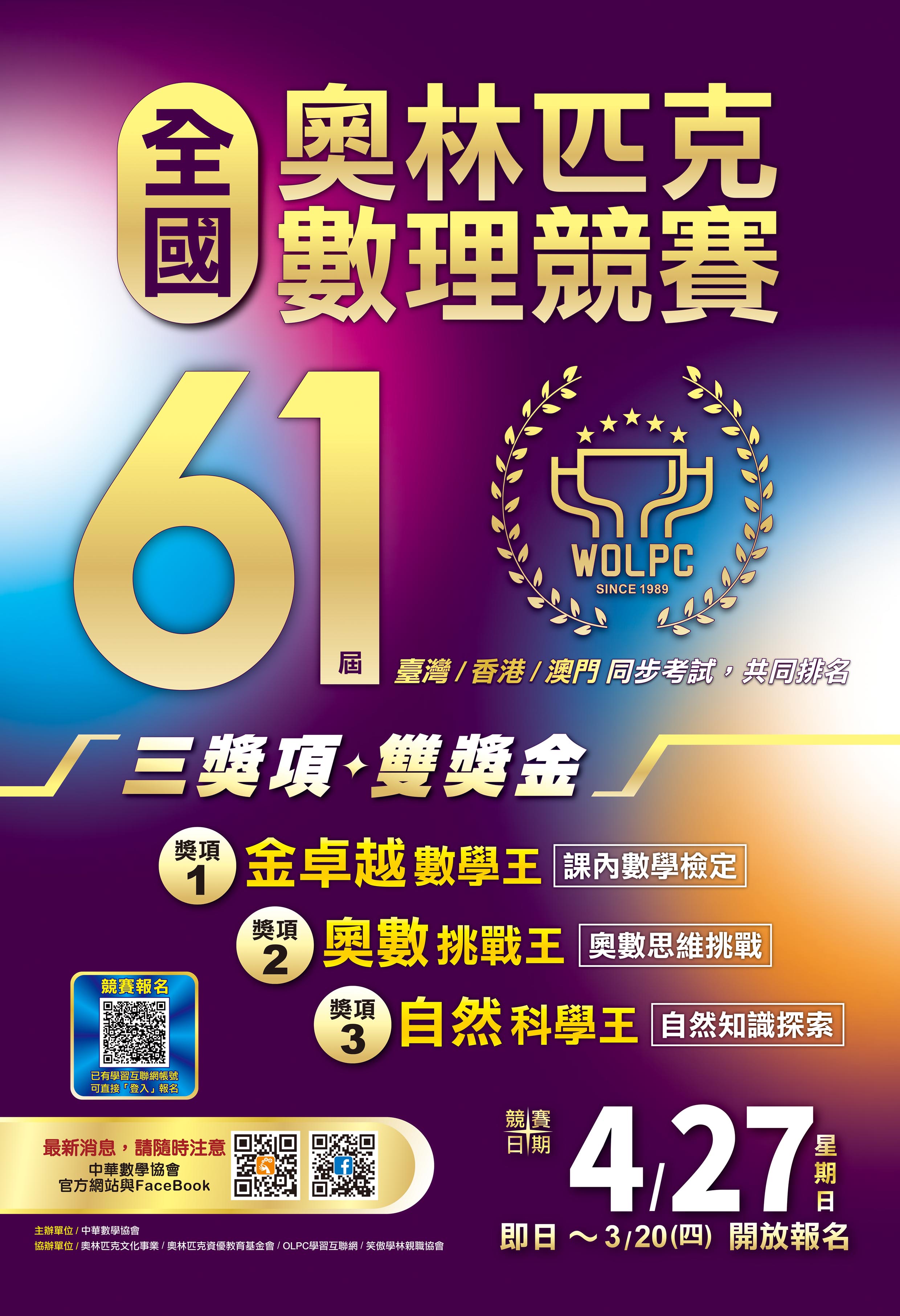 (2)互聯網不會寄發完成報名或下載准考證等通知,請參閱簡章內時間,自行上網查看競賽資訊。重要資訊都會發在中華數學協會官網或臉書,可多關注,避免資訊遺漏。