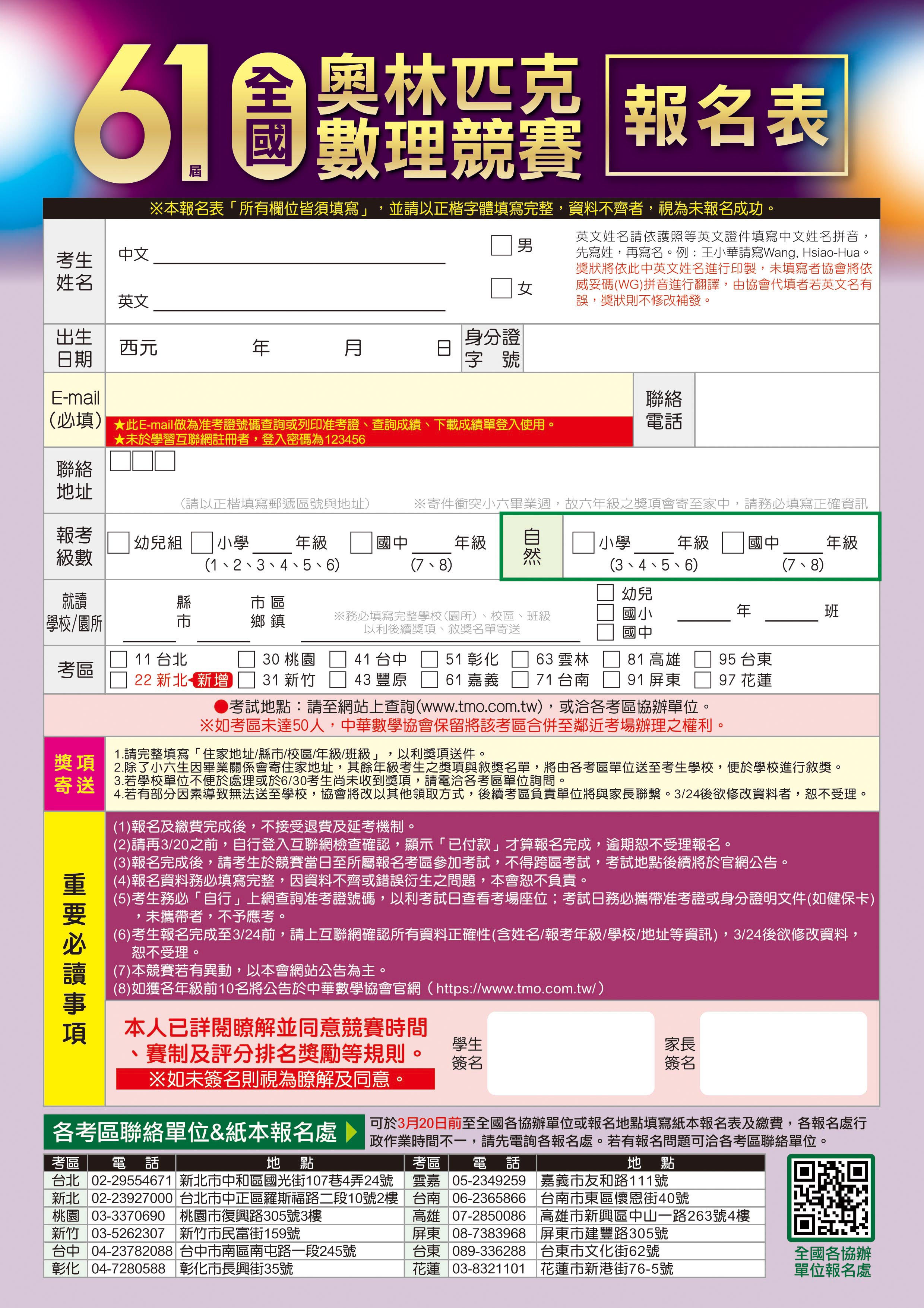 ※考場設立地點3/20報名截止前會於中華數學協會官網公告。