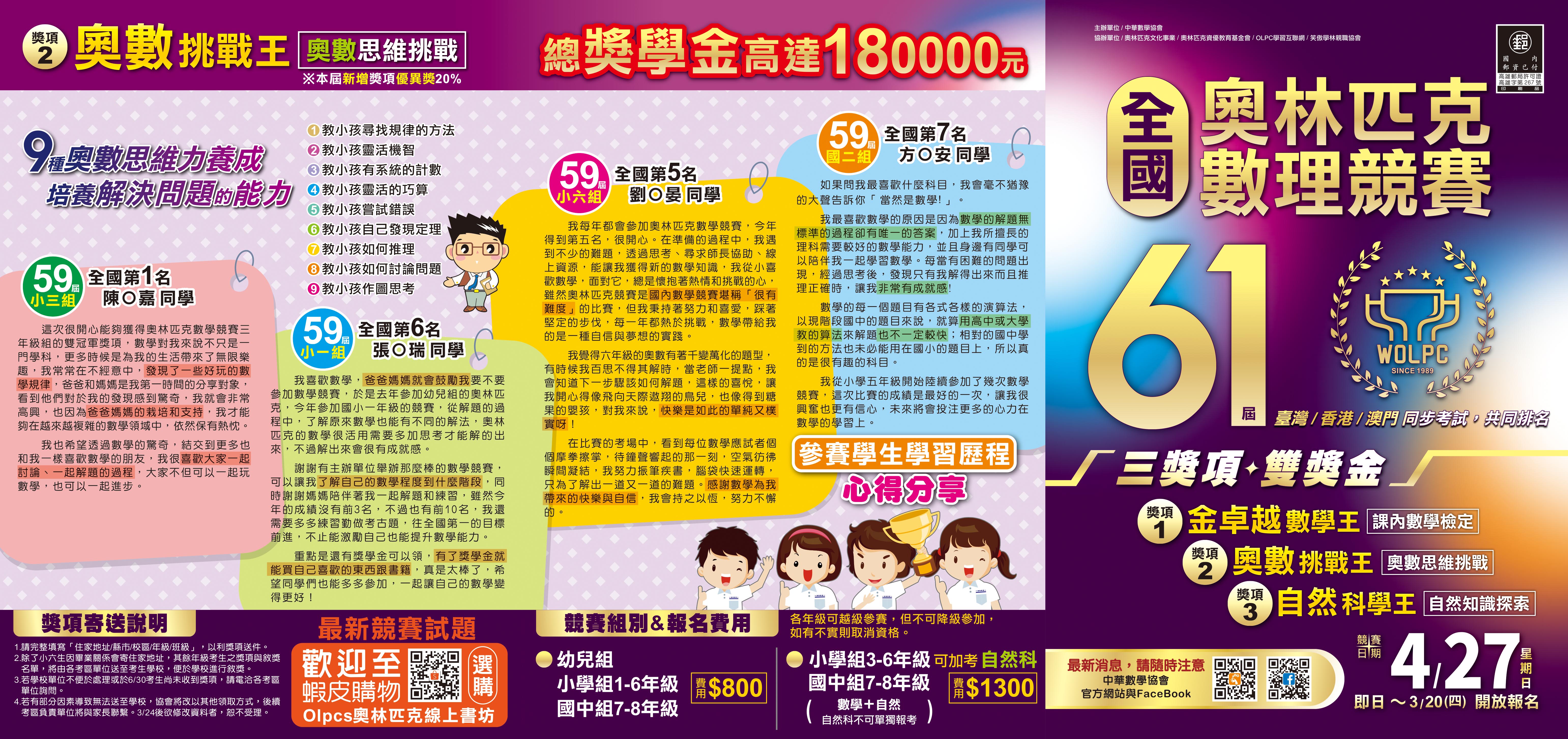 補充說明:因寄獎項的日程衝突國小六年級畢業週,故六年級考生之獎項會寄至家中,報名時務必確認住家地址無誤。