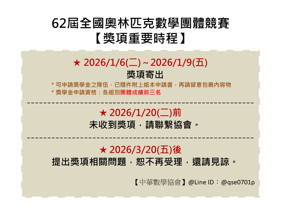 感謝各參賽單位及參賽者的耐心等候,第62屆全國奧林匹克數學團體競賽之獎項(獎狀、獎牌及獎盃),將於2026年1月6日(二)至1月9日(五)期間陸續寄出。
