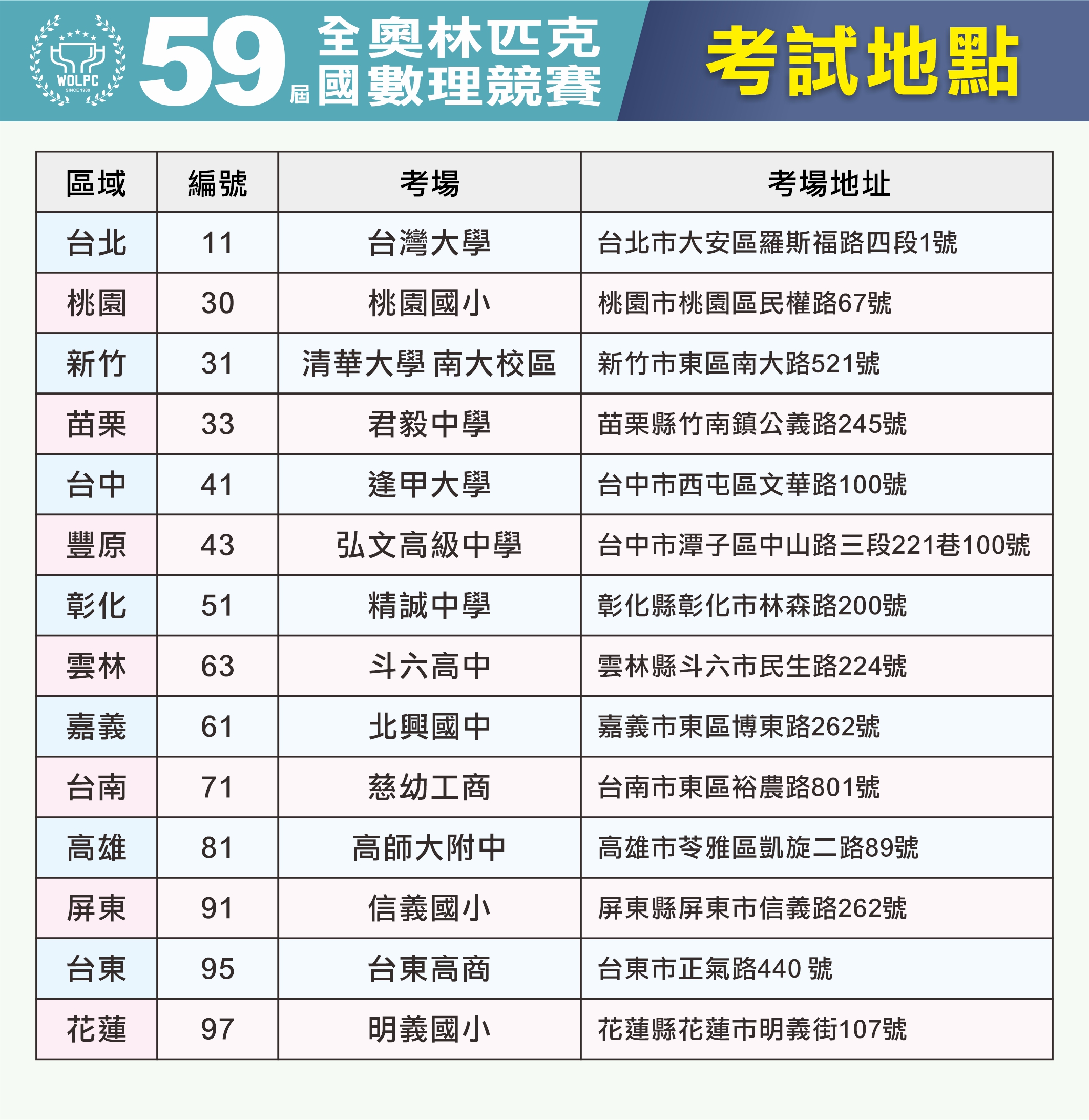 ★【第59屆 奧林匹克數理競賽】考場公告