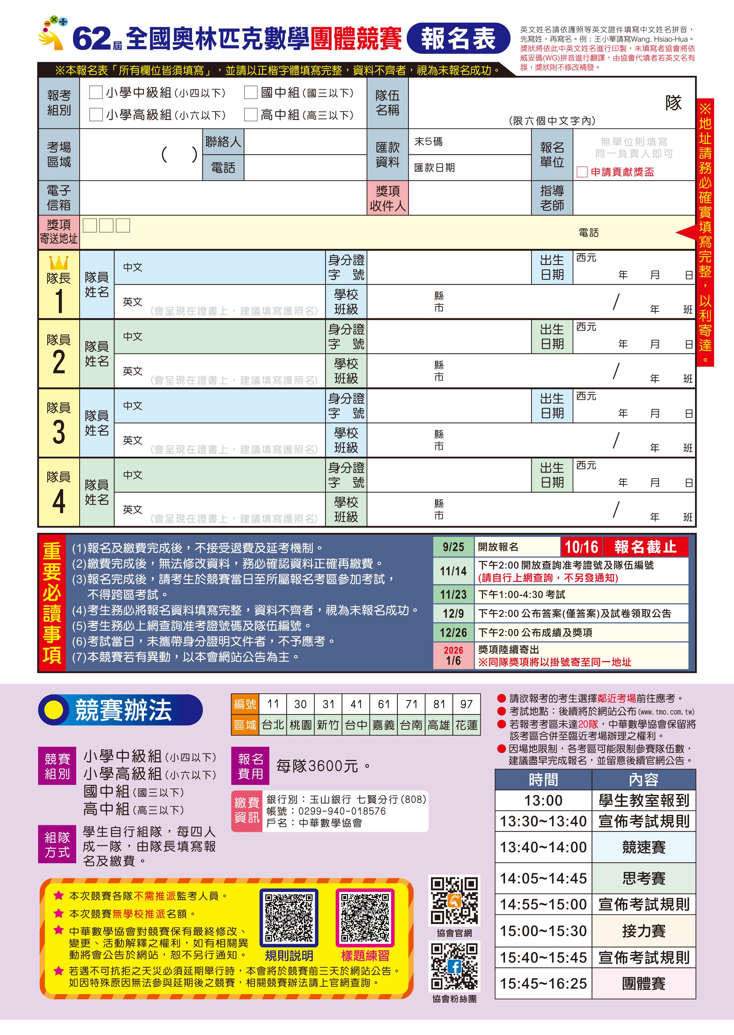 3. 試務人員統一由中華數學協會安排,報名隊伍無須推派試務人員。