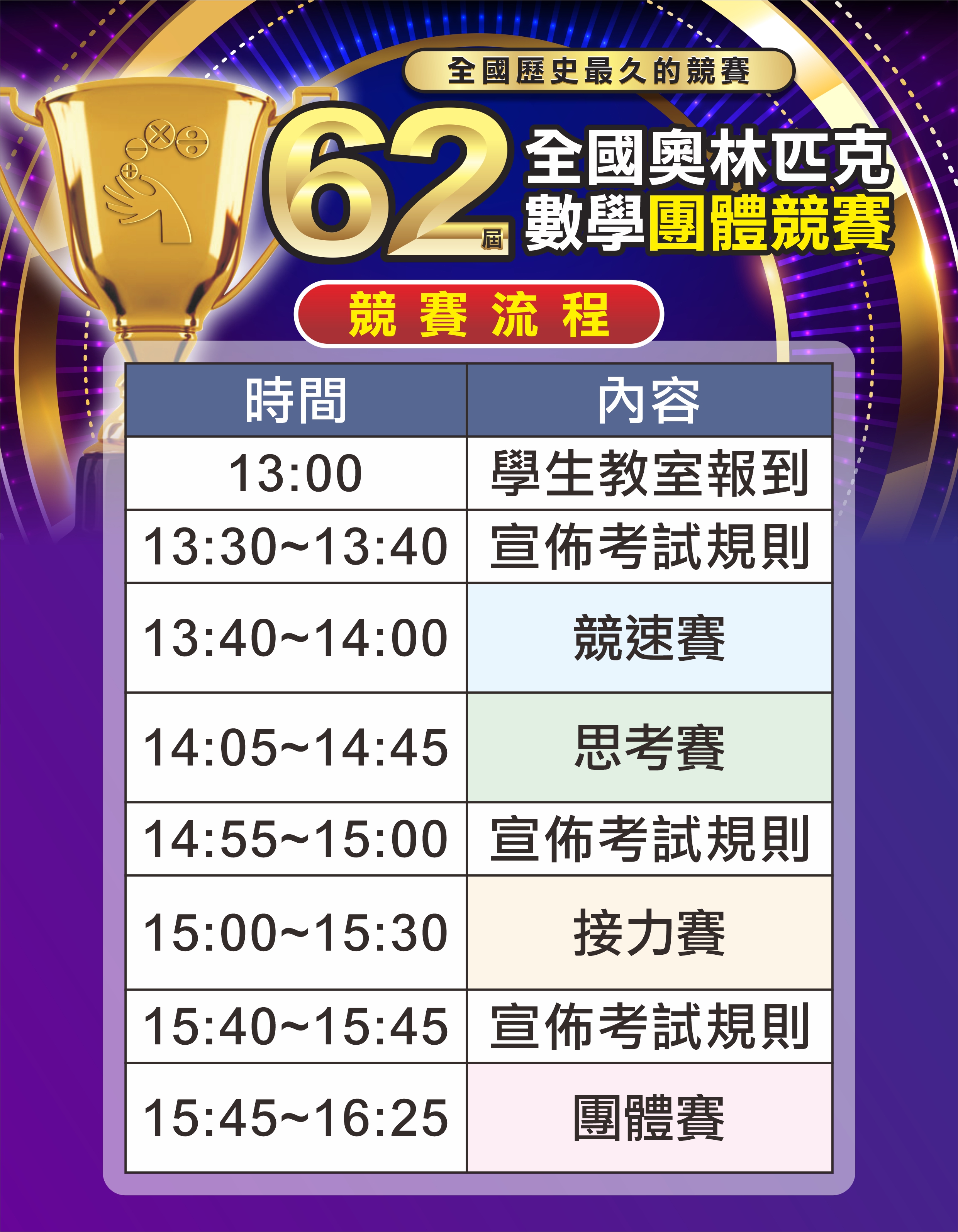 4. 個人賽第一輪(競速賽)作答使用2B鉛筆畫卡;個人賽第二輪(思考賽)、接力賽、團體賽皆使用鉛筆或原子筆寫於答案卷上。