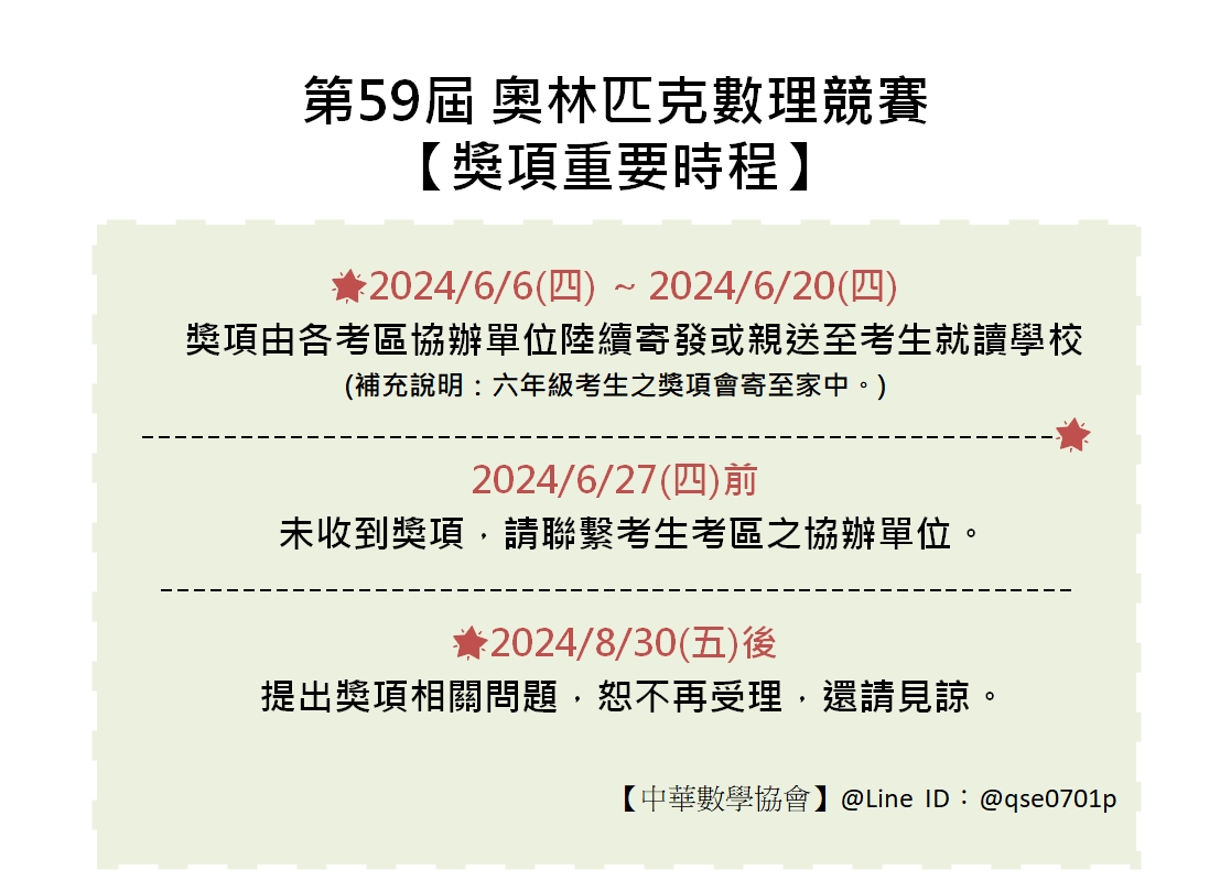 各考生獎項(獎狀/獎牌/獎盃),將於6/6(四)起,由各考區協辦單位陸續寄發或親送至考生就讀學校。