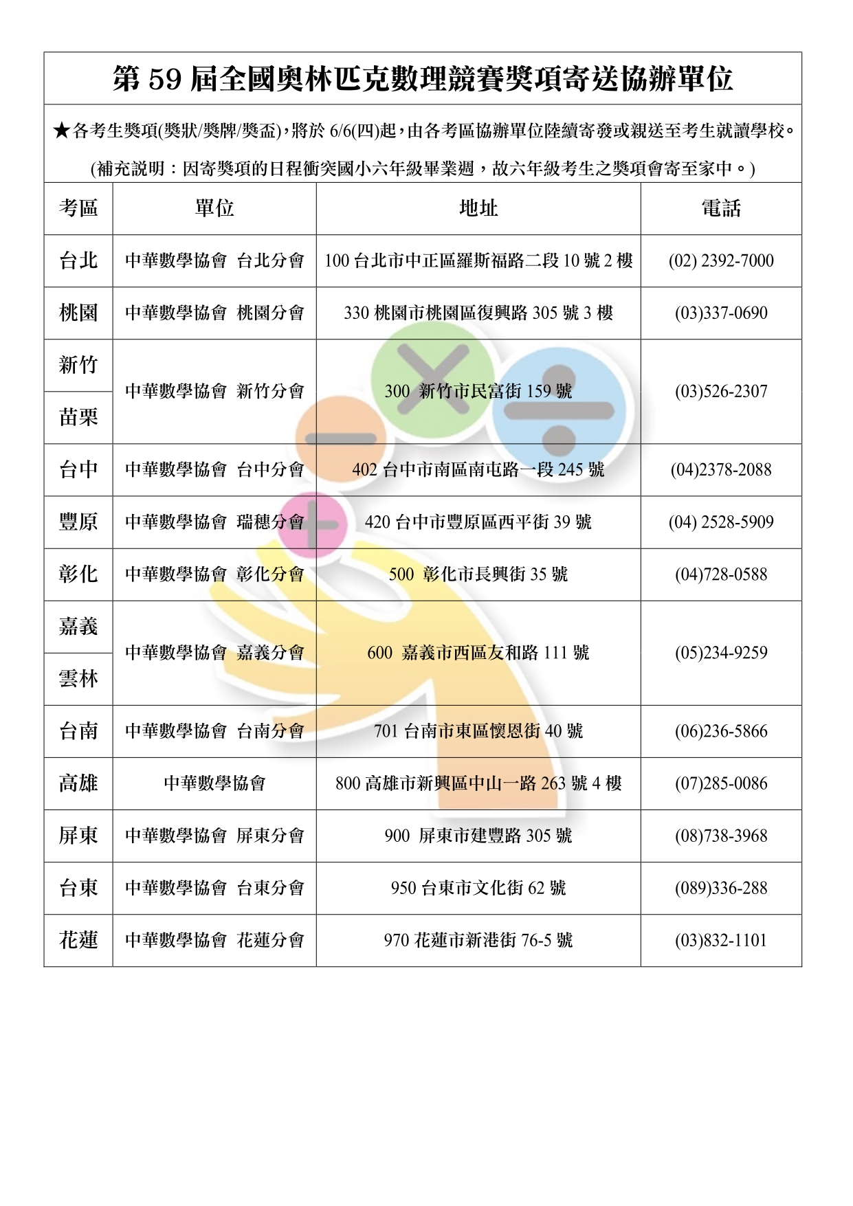 若有獎項寄送相關問題,請於下午3:30過後致電至考區協辦單位詢問。