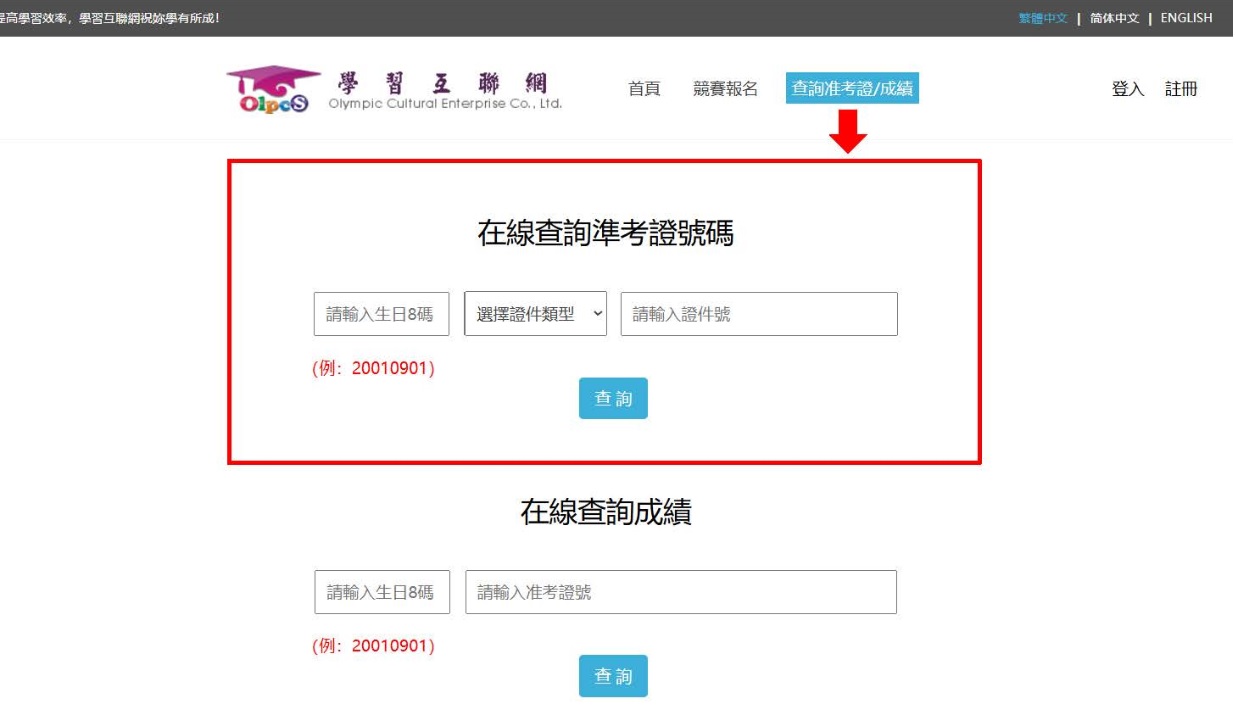 進入學習互聯網首頁,畫面右上角點選『查詢准考證/成績』,選擇證件類型,輸入證件號碼及生日8碼(如:20210118)查詢。