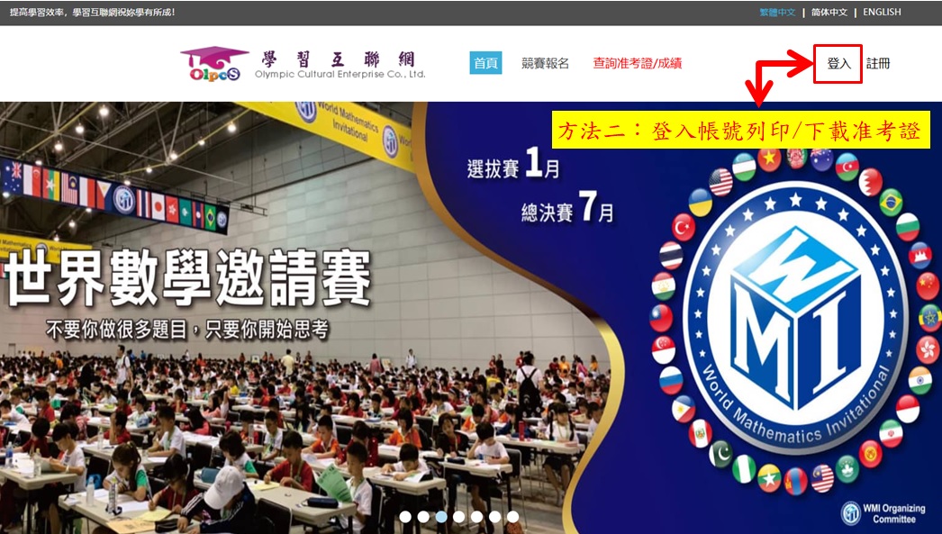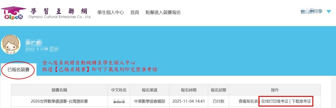 請使用電腦,進入學習互聯網首頁,畫面右上角『登入』後至學生個人中心點選『已報名競賽』即可下載/列印。