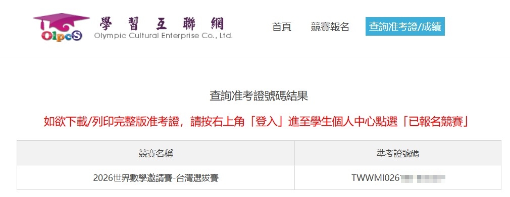 12/26(五)下午2:00起可上學習互聯網查看准考證號