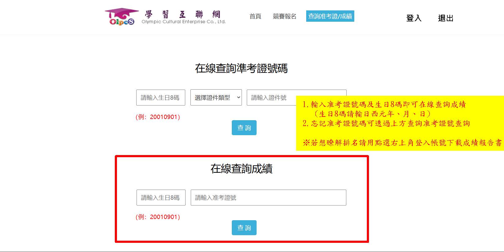 1.進入學習互聯網首頁,畫面右上角點選『查詢准考證/成績』,輸入准考證號及生日8碼(如:20210521)查詢。