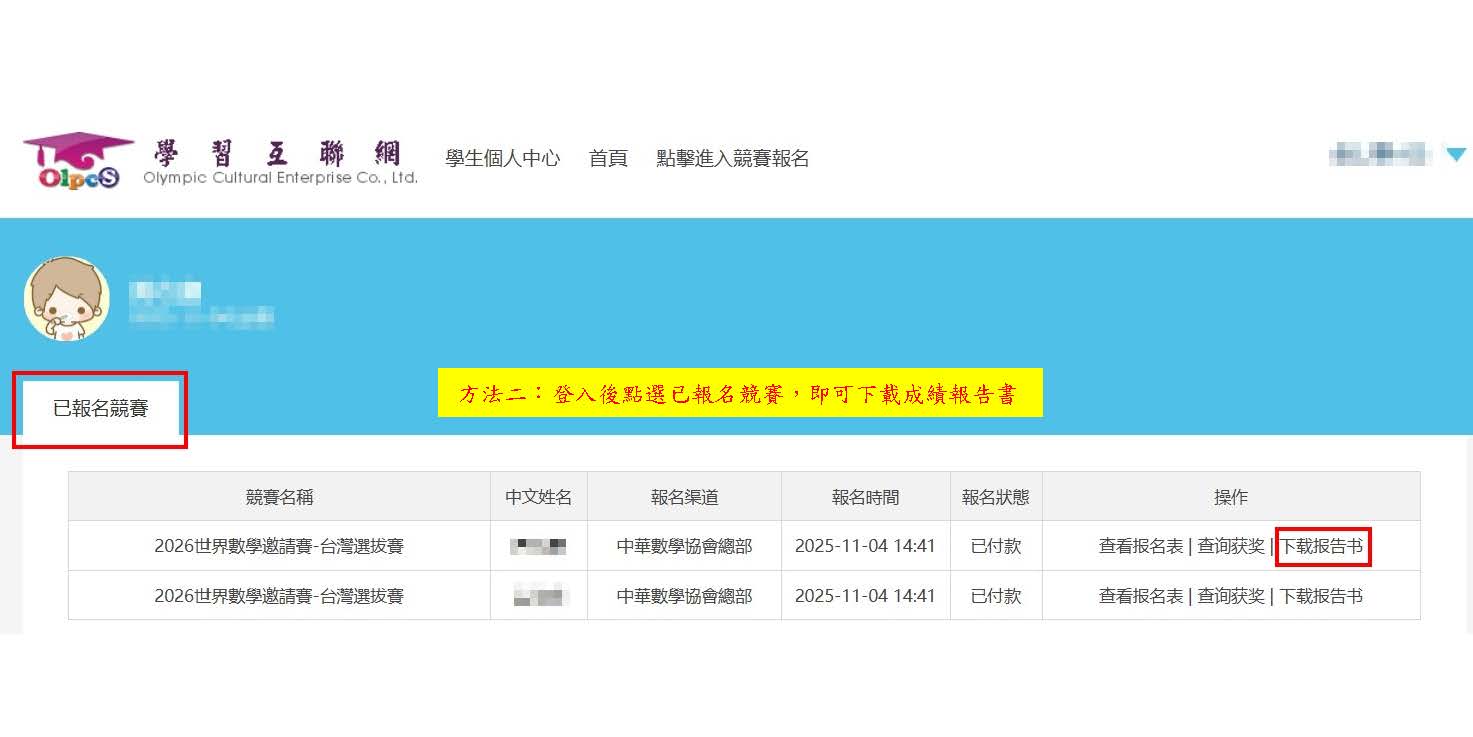 2.進入學習互聯網,『登入』後至學生個人中心點選『已報名競賽』即可查看並【下載/列印成績報告書】。