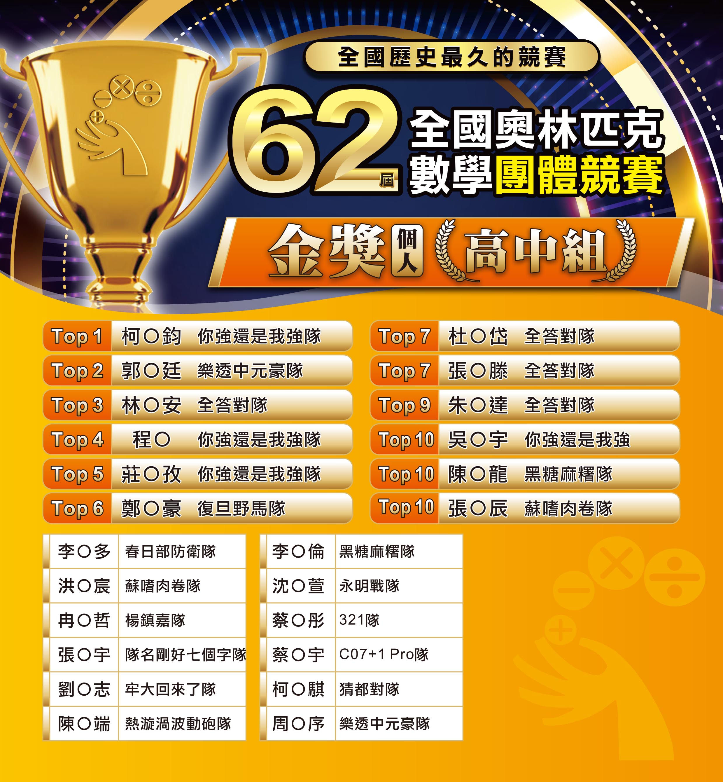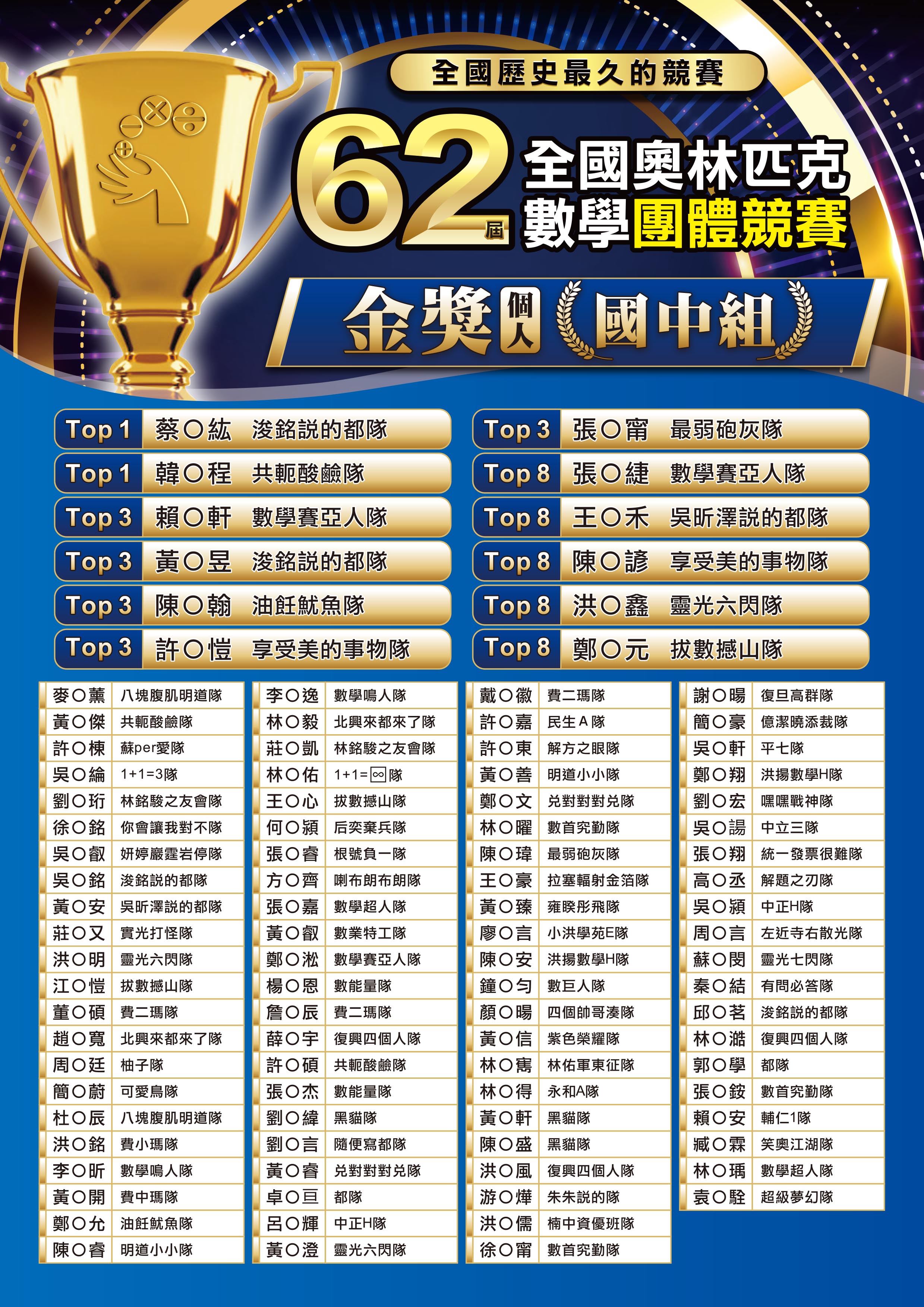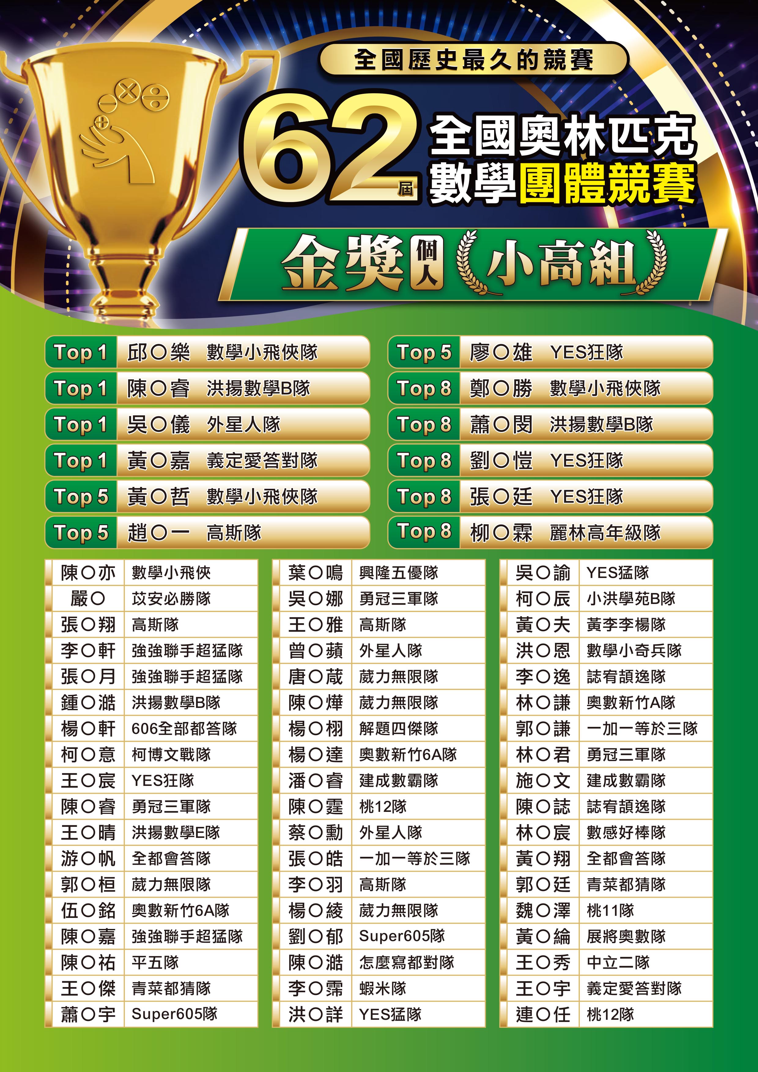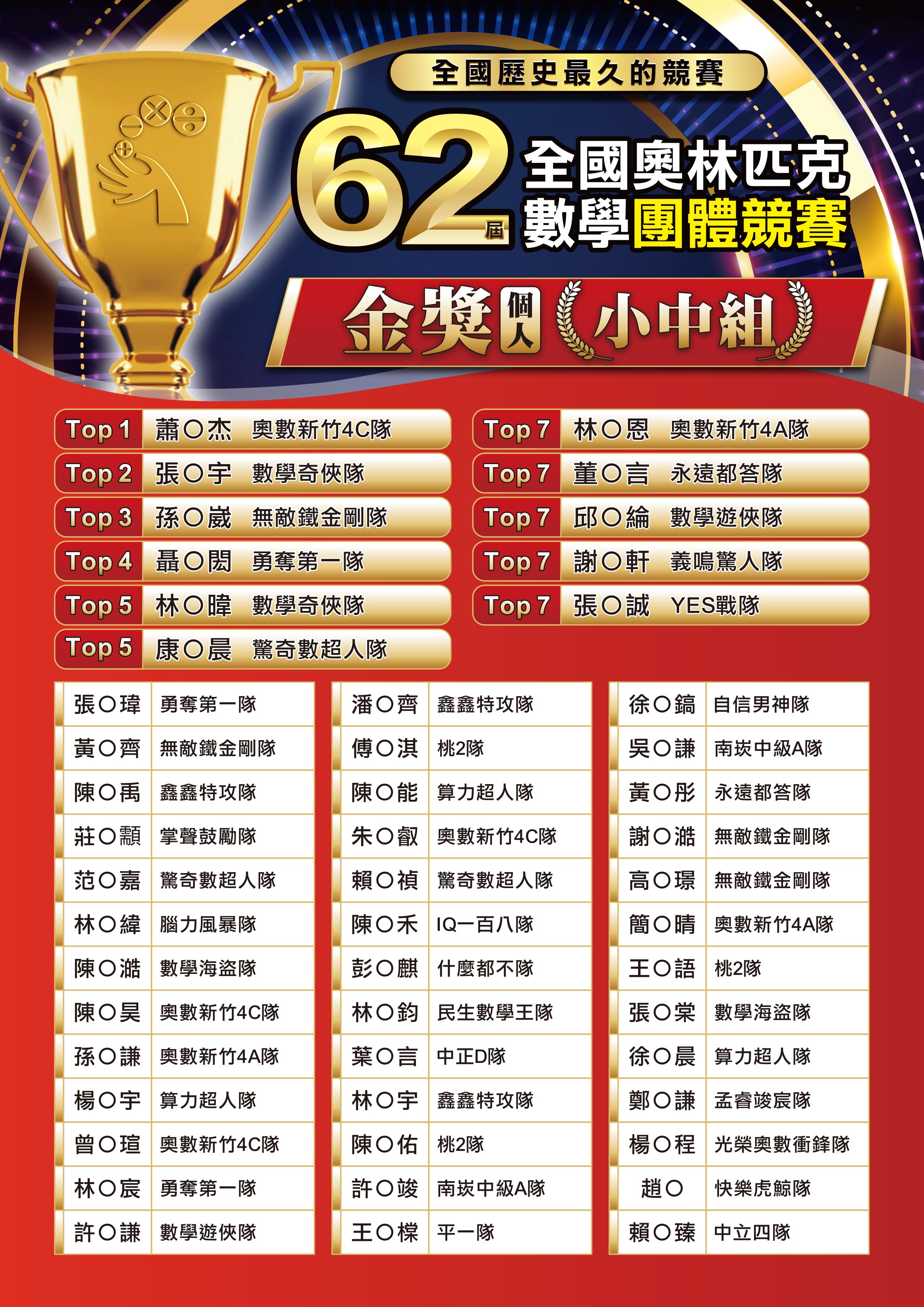 獎項1/6起陸續寄出。1/15未收到獎項,請來訊詢問。(中華數學協會 lineID:@qse0701p)