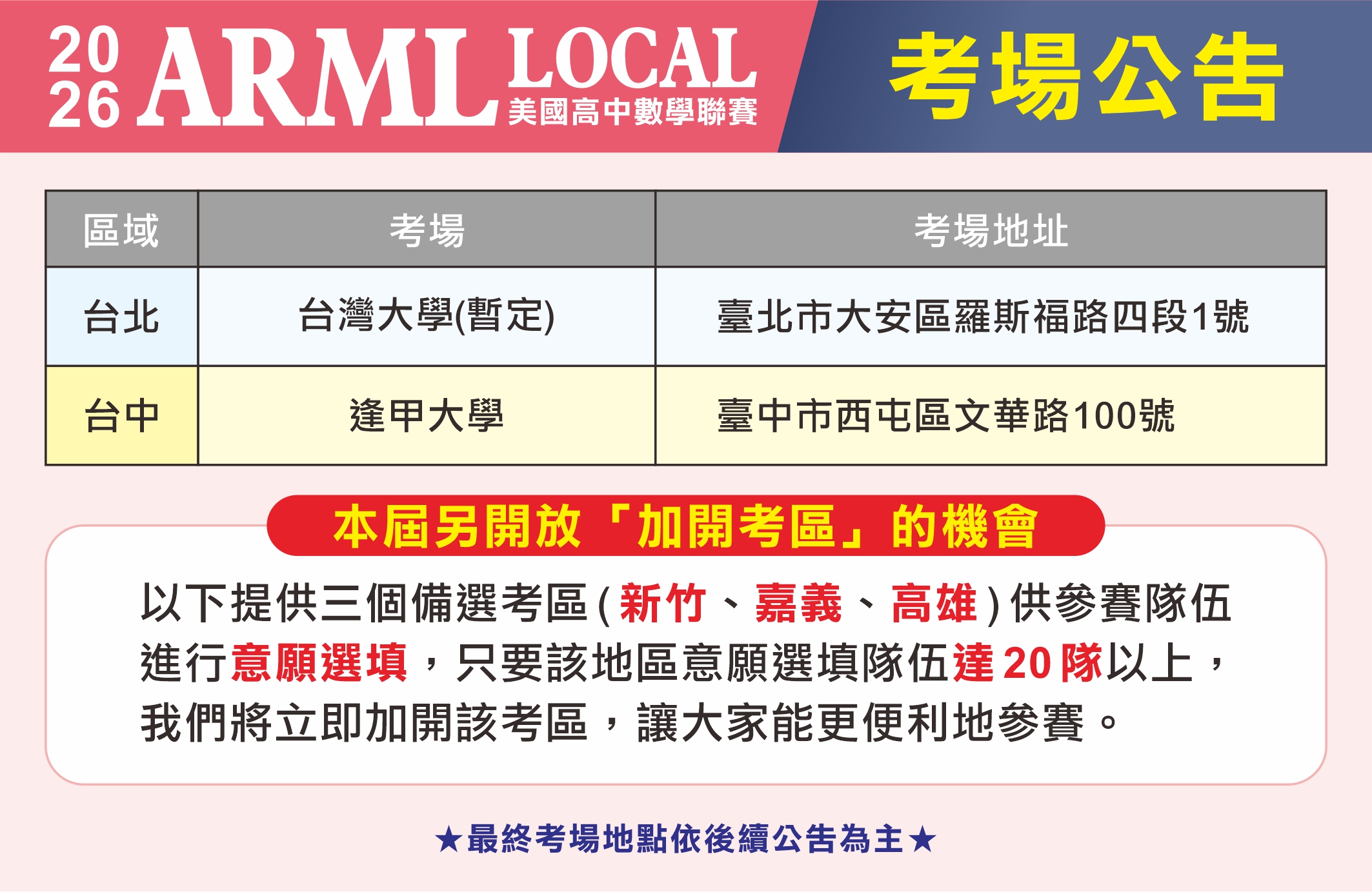 *開放「加開考區」的機會:以下提供三個備選考區(新竹、嘉義、高雄)供參賽隊伍進行意