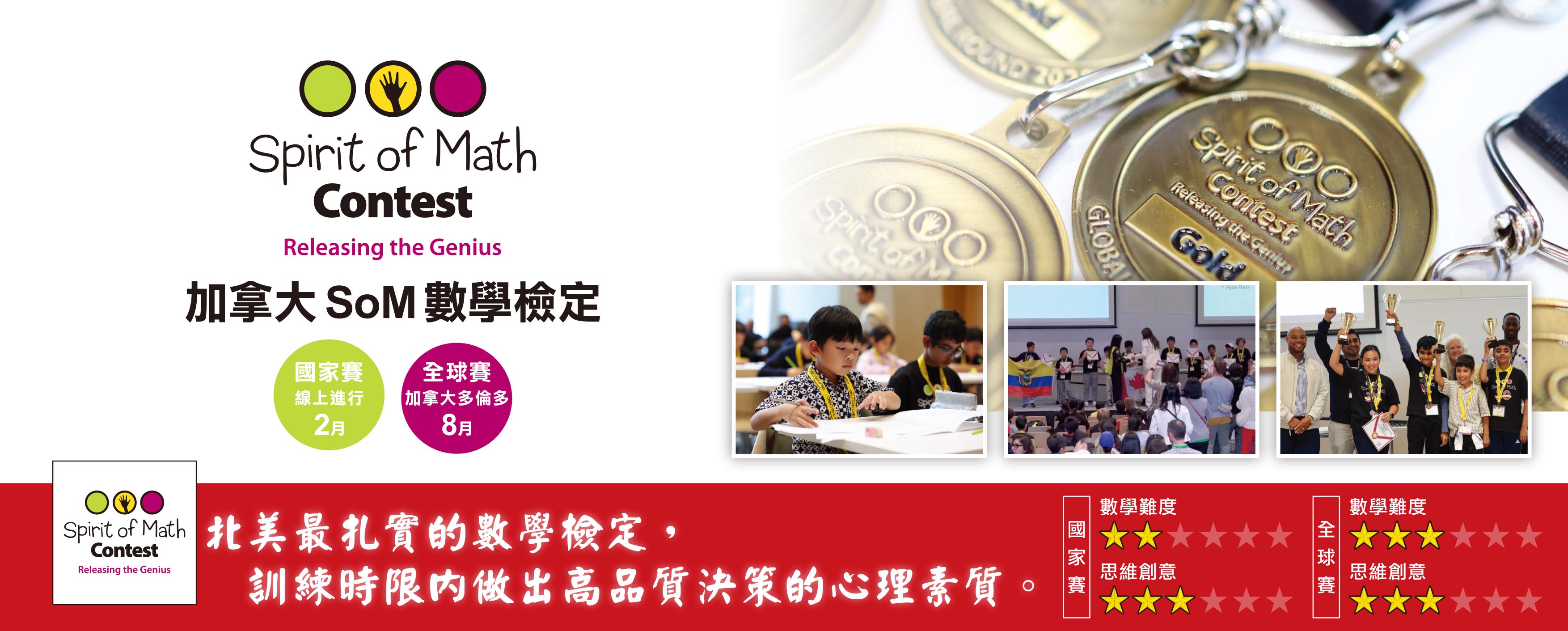 SoM最初僅針對加拿大低、中年級學生舉辦,後續不斷延伸合作、規模逐漸擴大。即將邁入第27屆的SoM,除了參加年齡擴展至8年級,更增廣到30多個國家一同參與,使學生不僅能挑戰自我、精進數學能力,也提供與全球同齡菁英交流切磋的難得機會。